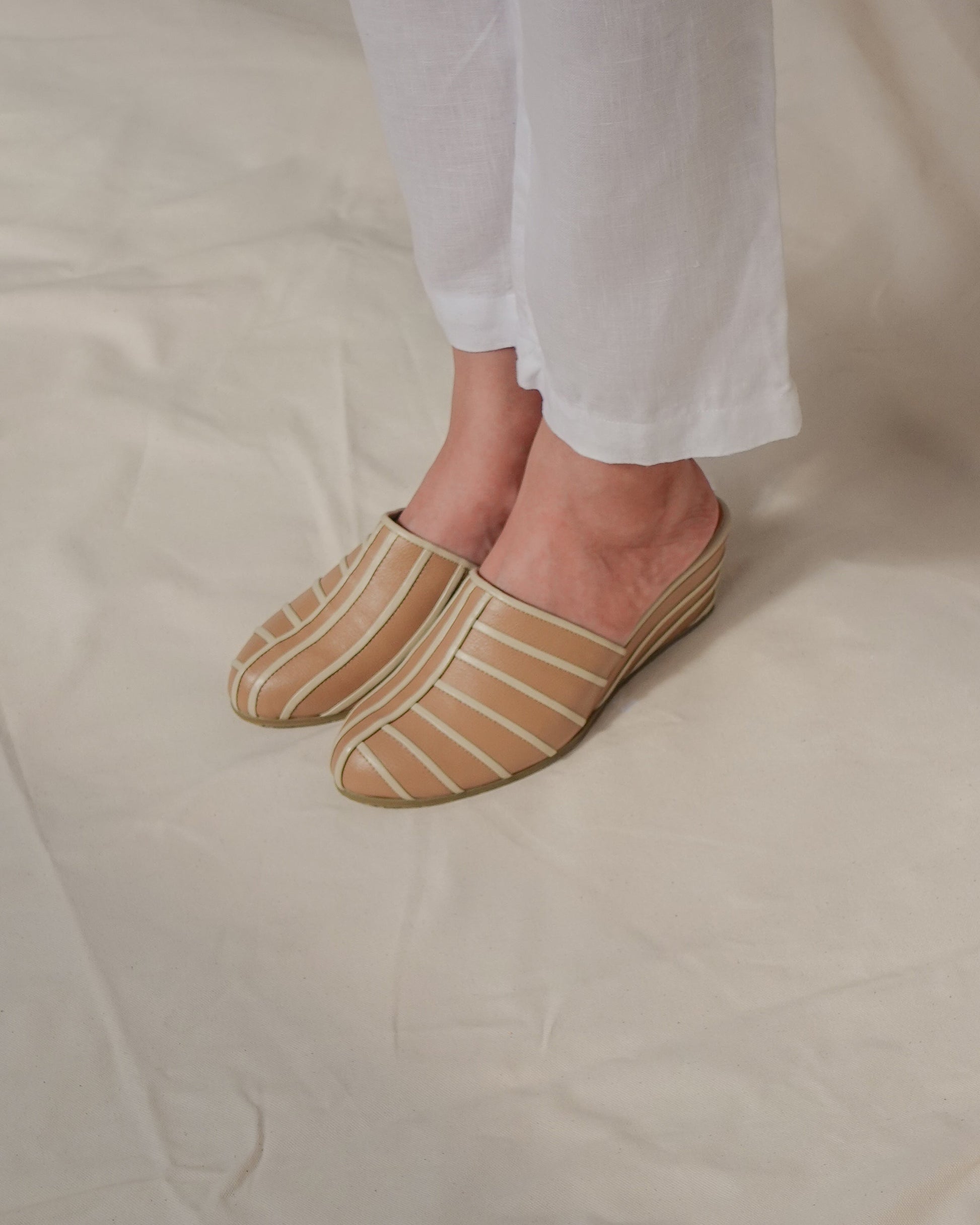 The Alia Mule is the sister style to the Amara Slide in wedge version. We used the same patchwork technique we apply on the Off Grid styles but this time played with lines, direction, and color. The Alia Mule is a minimal and visually interesting wedge that we consider to be the most versatile style from this drop. She can elevate a casual look, she can take you to work or she can carry a day to night look.