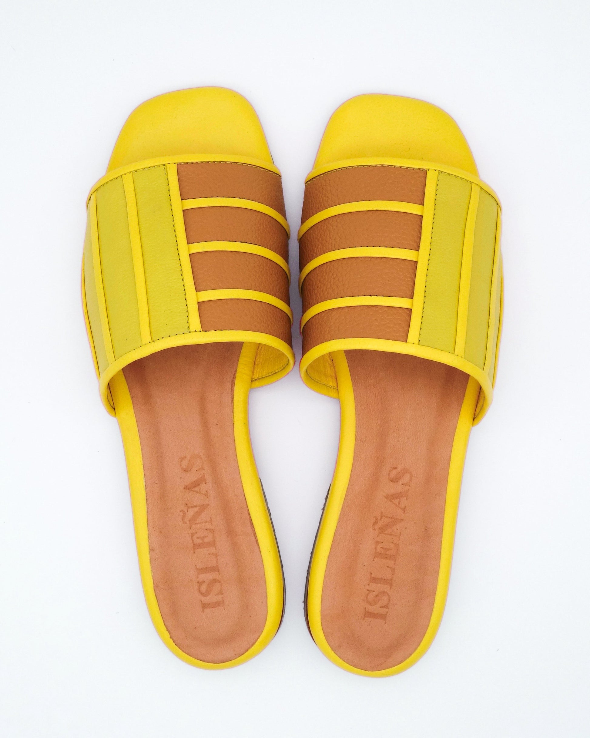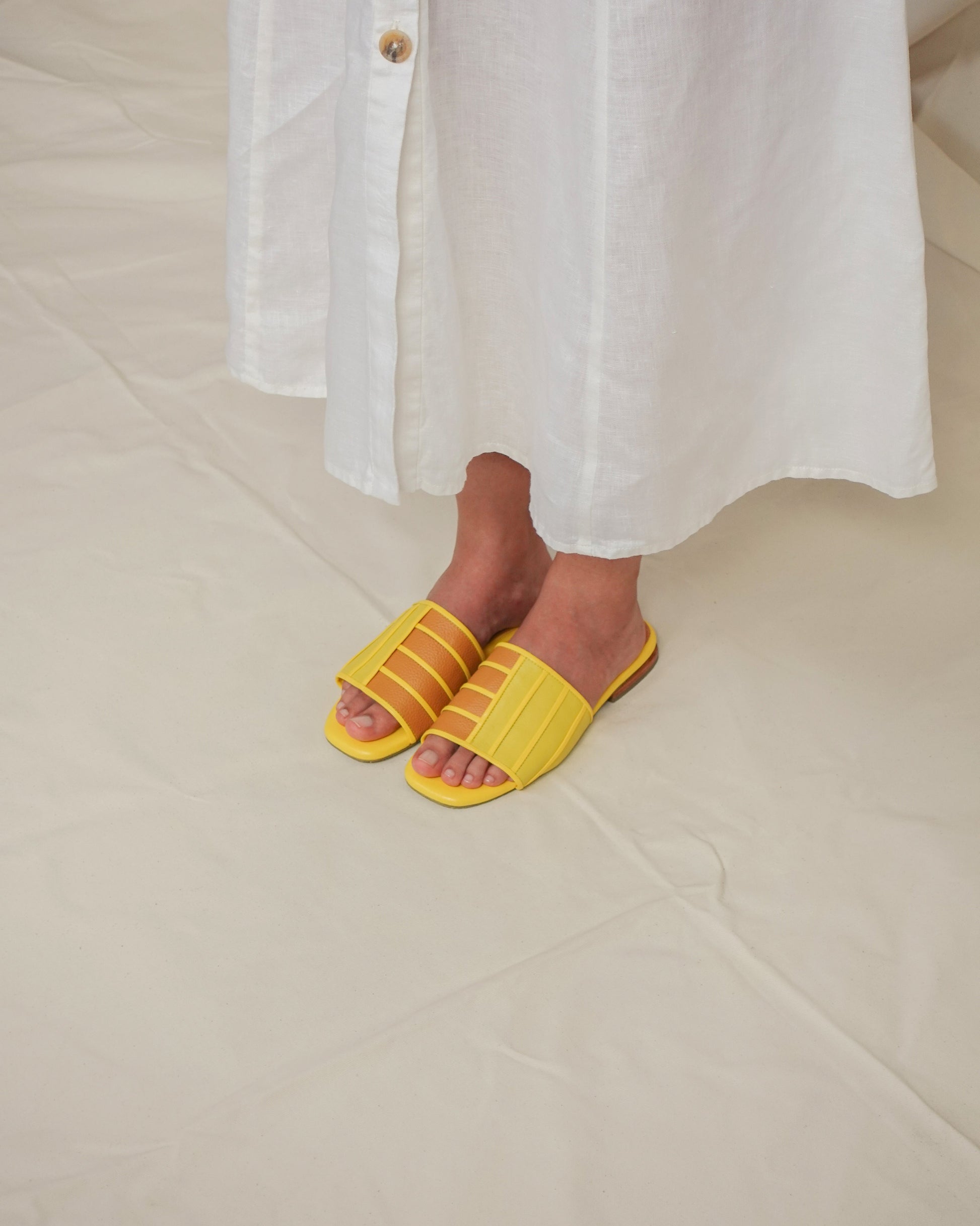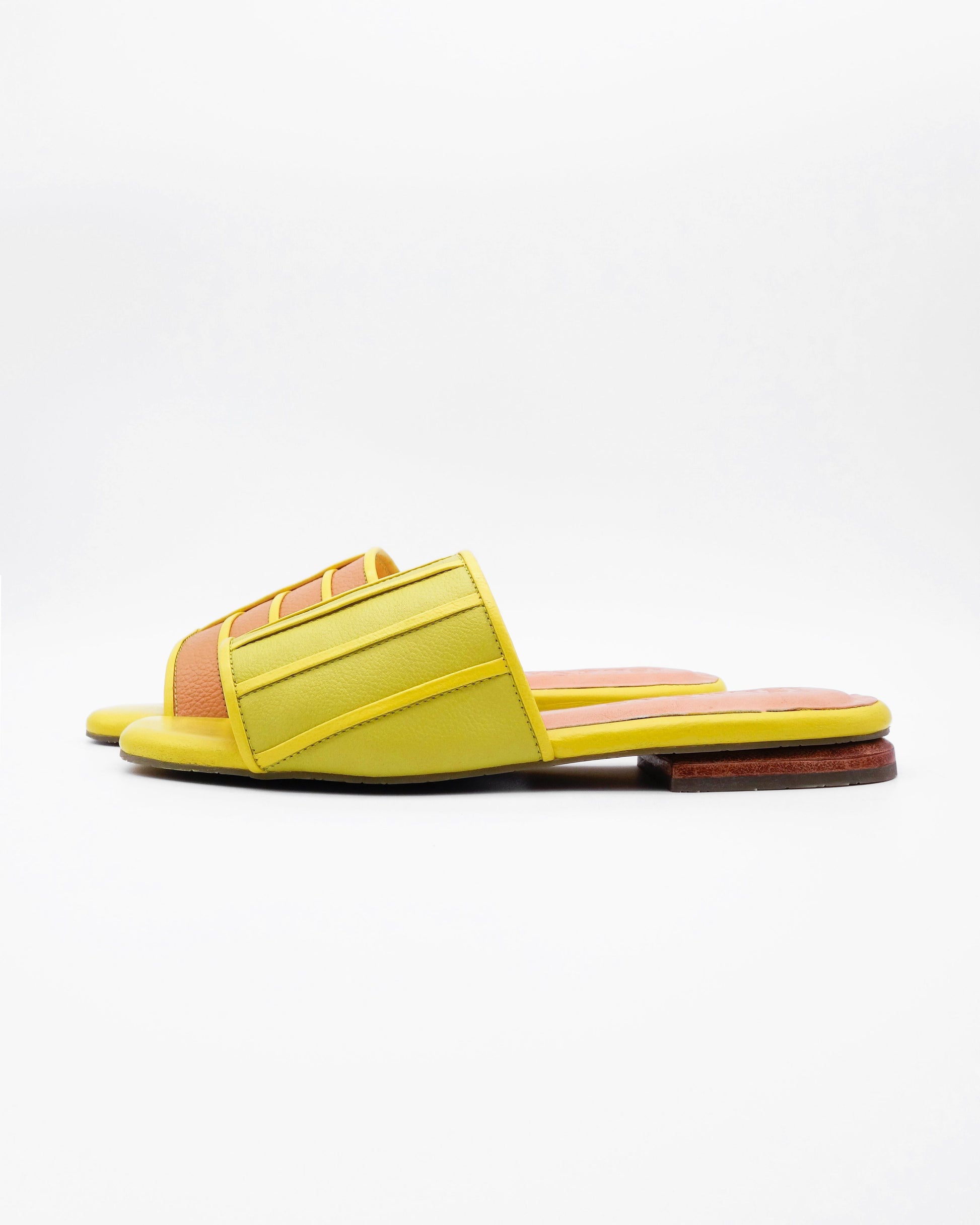 The Amara slide is not a grid! We still used the same patchwork technique we used on the Off Grid styles but this time played with lines, direction, and color. The Amara is a minimal and visually interesting slide that can elevate a casual look.