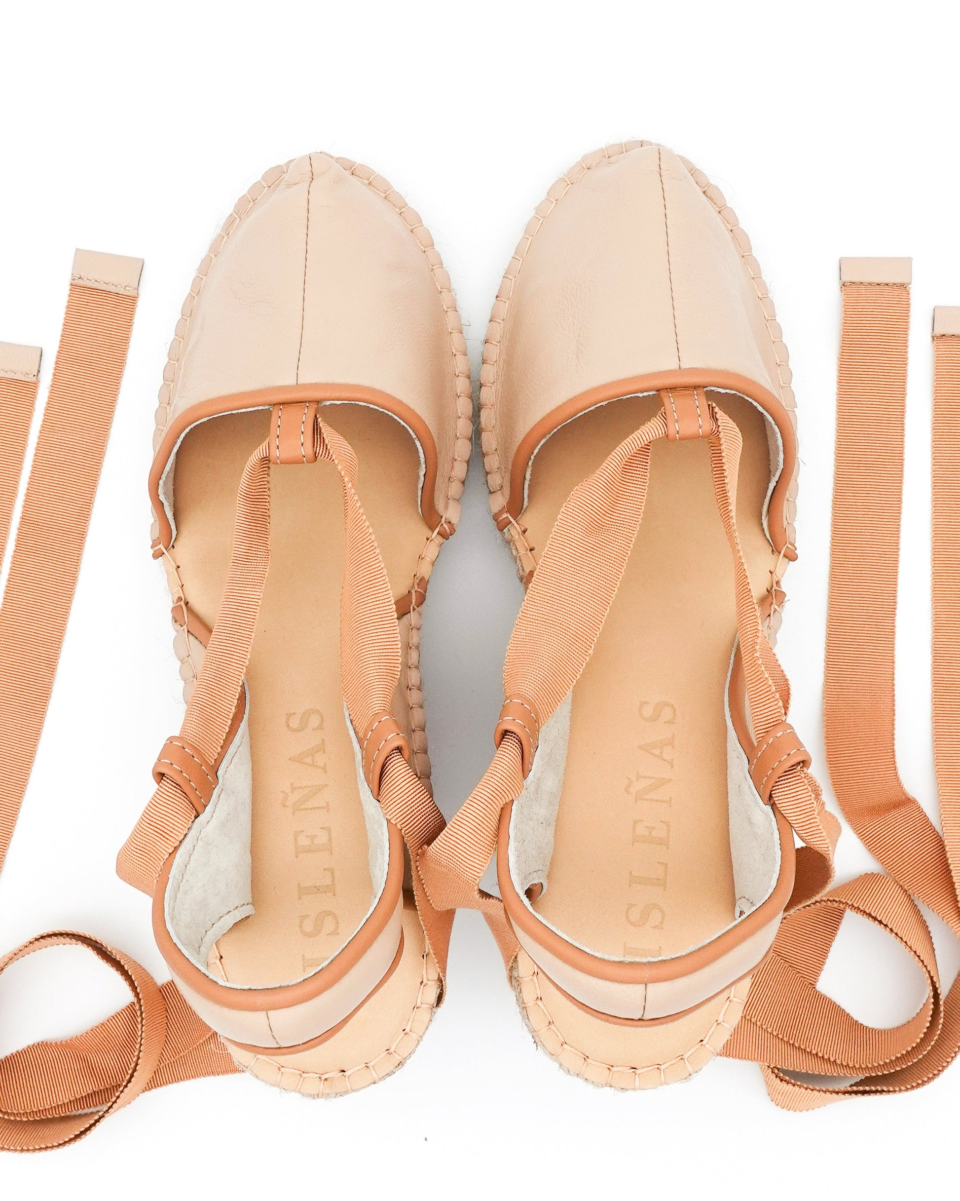 The Cecilia is a classic espadrille made with soft lambskin on a 3 inch / 8 cm wedge sole. The center seam, french piping, and oversized rayon ribbon with leather ends make this romantic silhouette have a graphic or more modern look.